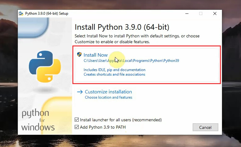 - 勾选左下角 Add Python 3.9.0 to PATH 选项,然后选择 Install now 立刻安装Python