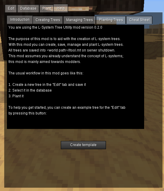 该模块还具有一个内置的帮助系统 ,可以帮助您入门此模块(需要了解如何在Minetest中使用L系统树)。