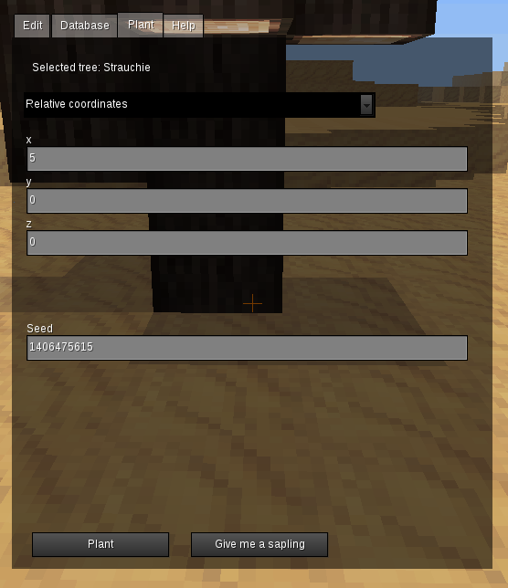 第三个标签用于实际种植/产卵树木。您可以选择通过提供绝对或相对坐标来立即生成树。相对坐标是相对于您的位置的。