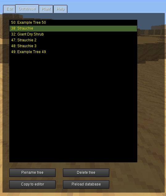 四个选项卡是:编辑(……一棵树),数据库(……一棵树),植物(……一棵树)和一个简单的帮助。