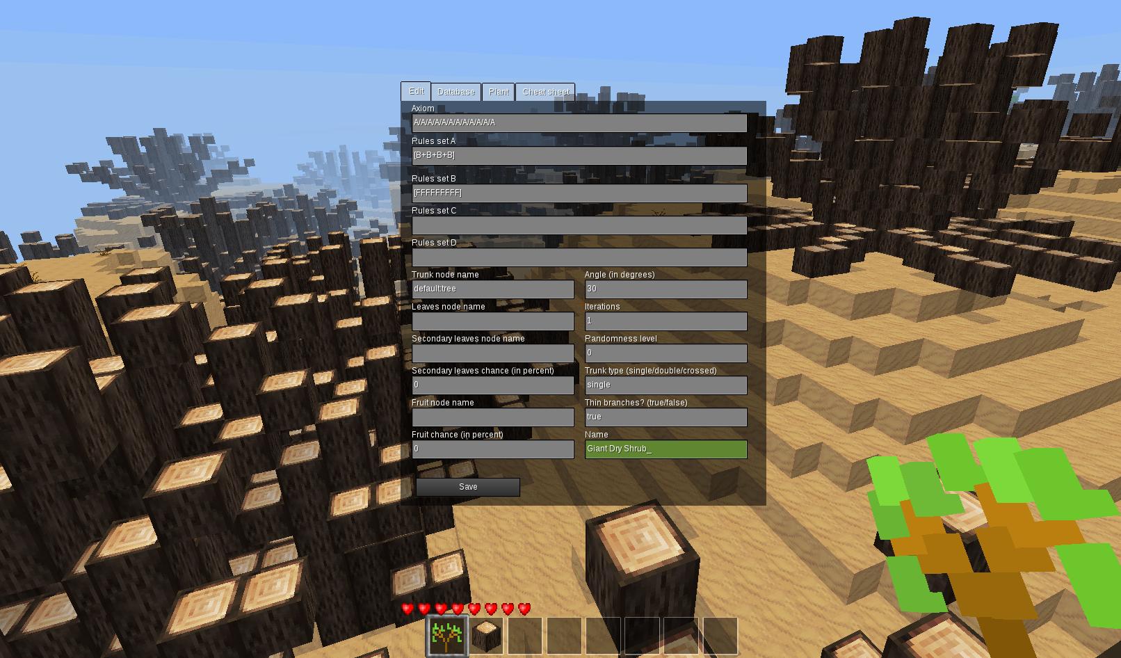 这个mod旨在帮助mod开发人员尝试使用L系统树定义。它提供了一个简单的formspec,它是minetest.spawn_tree的包装,具有许多其他功能。如果您不知道此功能或L系统如何工作,则此mod不适合您。但是,您可以在这里学习两者: