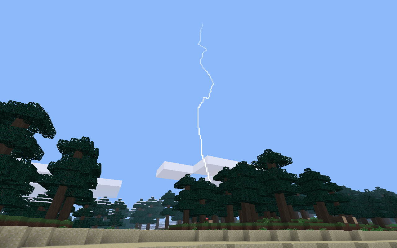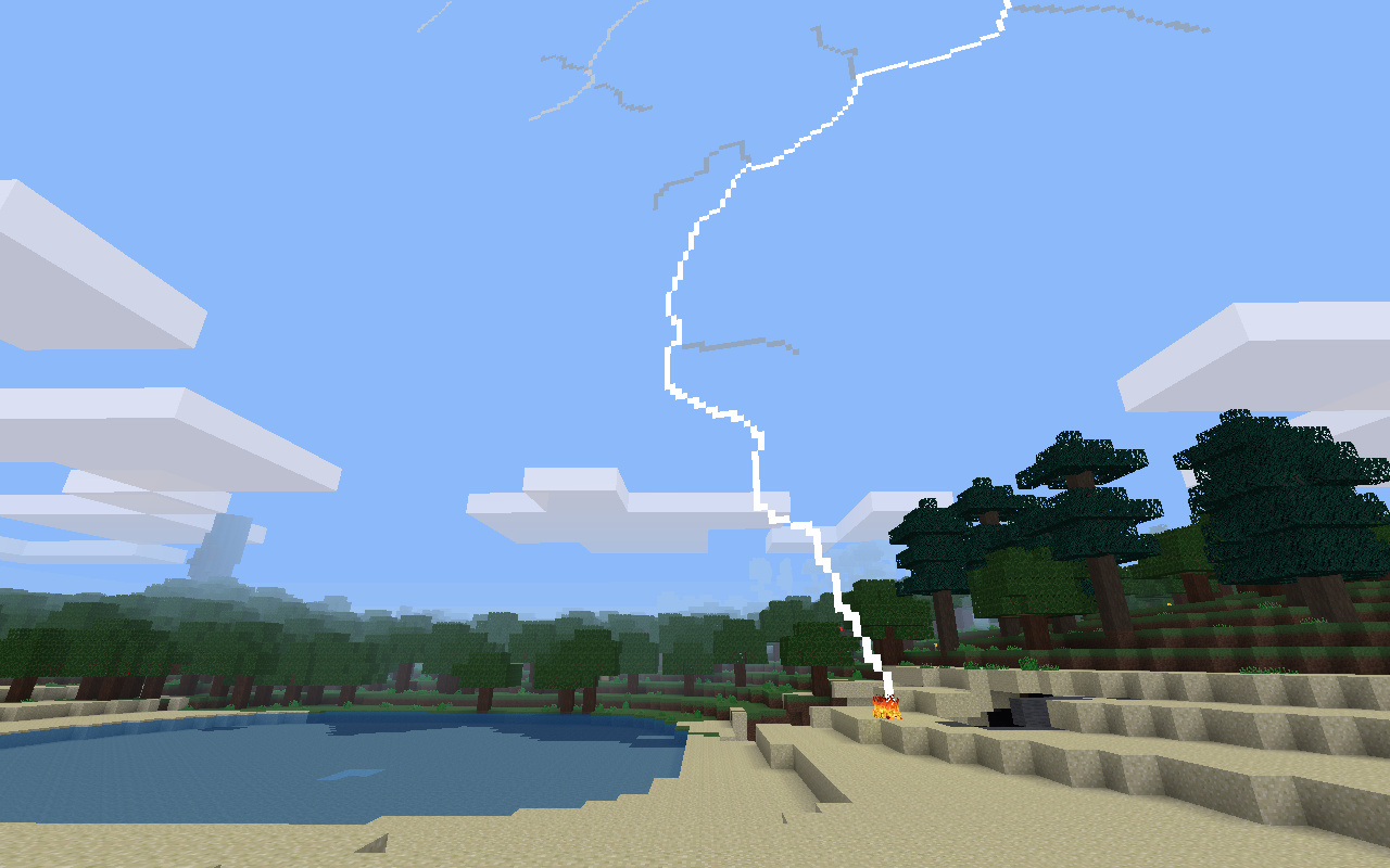 雷击随机发生在地面上,着火了,可能将沙子变成玻璃,将树干变成煤炭,等等!该国防部包含几种纹理和声音。雷电时,整个天空都被照亮了!