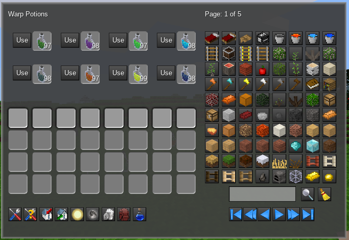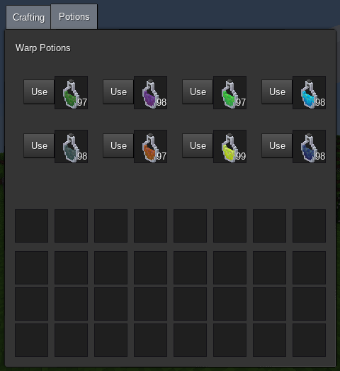 This mod adds eight warp potions which can be placed as decorative items. Smashing a warp potion after it has been placed sets a warp point for that player. There are eight warp points, one for each potion, which can be independently set and are unique to each player. Using a warp potion in the potion inventory will return the player to the warp point for that potion.
