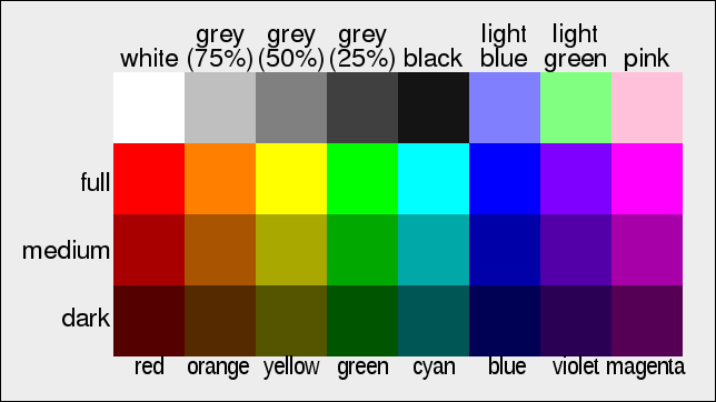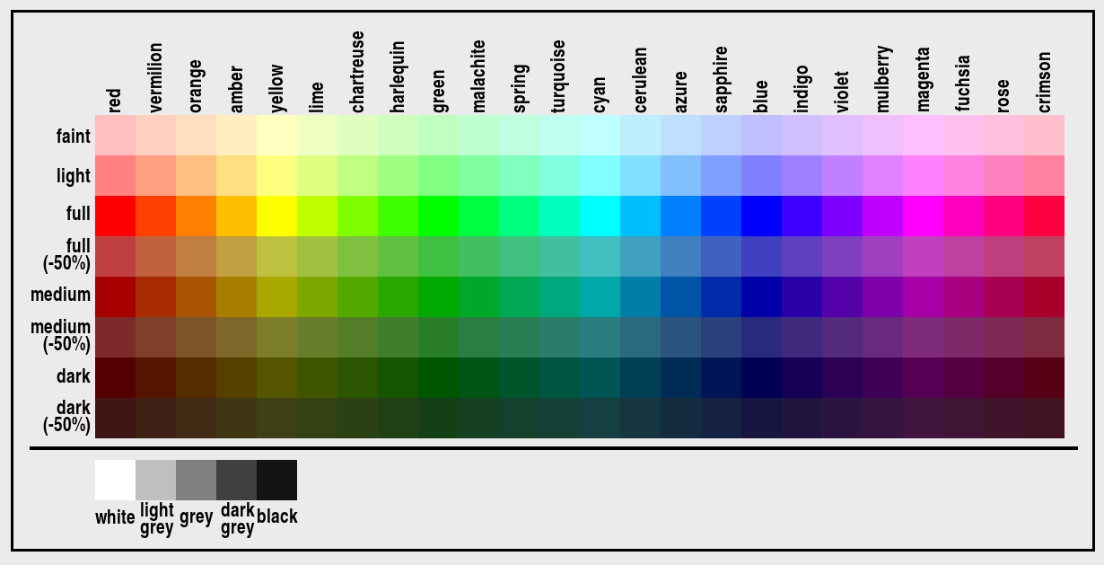 在这些图像中,某些阴影旁边左侧的“ -50%”标记表示该阴影线中所有色相的饱和度为50%。请注意,“完整”上方的阴影没有(或不需要)这种变化,因为它们已经通过加亮全色而生成,因此饱和度较低。对于灰色,显示的百分比是相对于纯白色的亮度。在这些调色板中,有一些特殊情况:粉色代表浅红色,棕色代表中等橙色,深橙色的配方与标准配方不同。我从该网站获得了更深奥的颜色的名称:http : //www.procato.com/rgb+index/