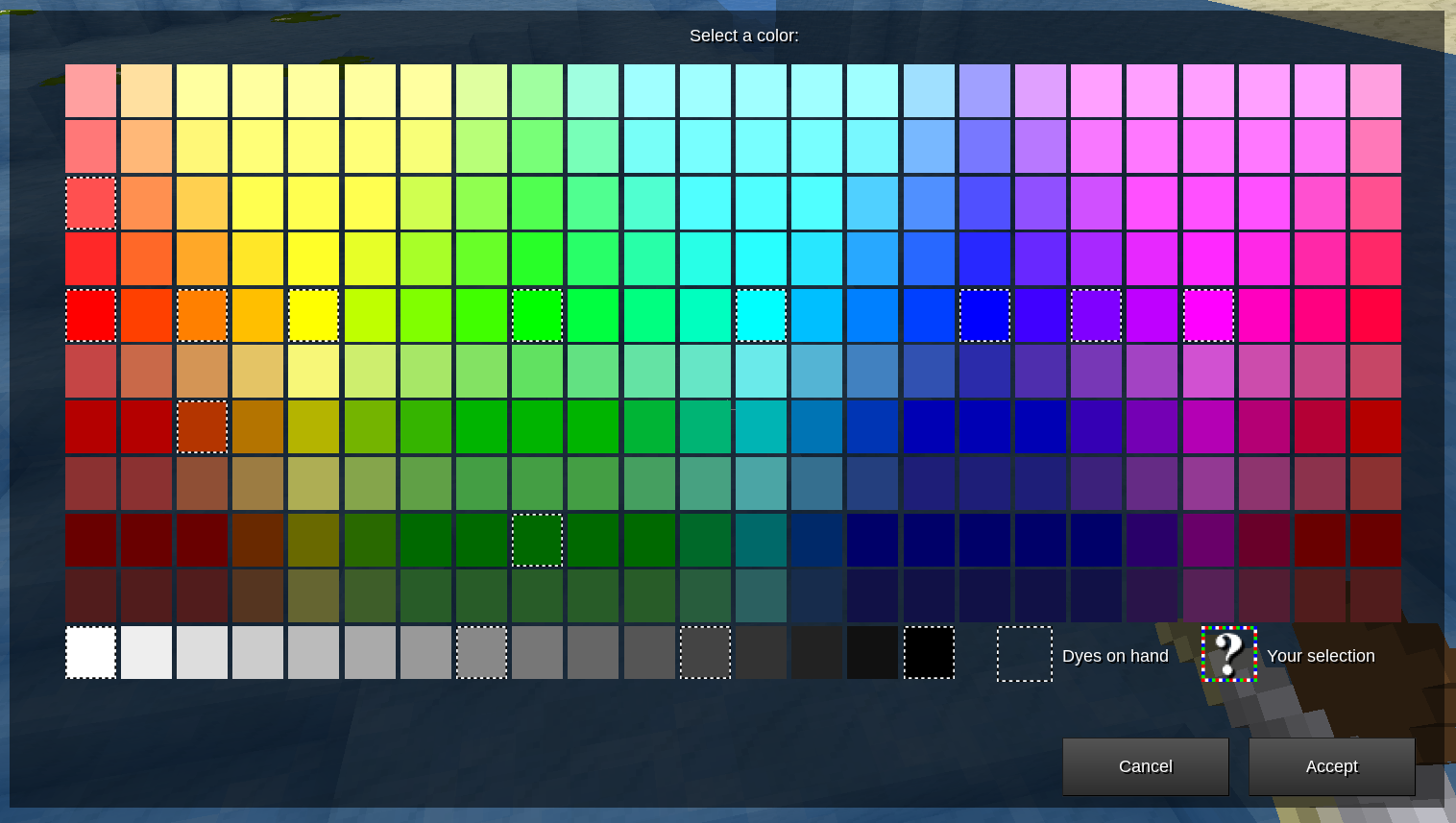 在生存模式下,要绘制的任何染料都必须位于库存中的某个地方(任何地方),除了手工网格外。如上所示,您的现有染料将在选择器中突出显示,并且选择器将您的选择限制为仅突出显示。当您使用喷枪重涂节点时,将消耗选定的染料。