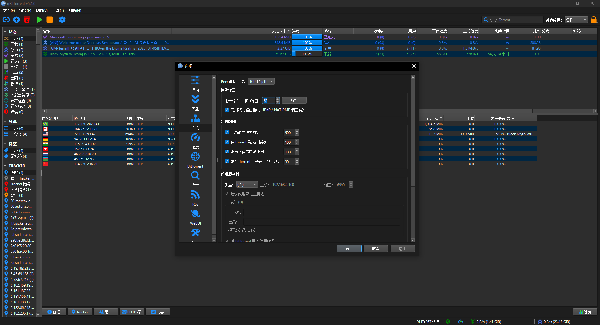 - IP 过滤(eMule dat 和 PeerGuardian).