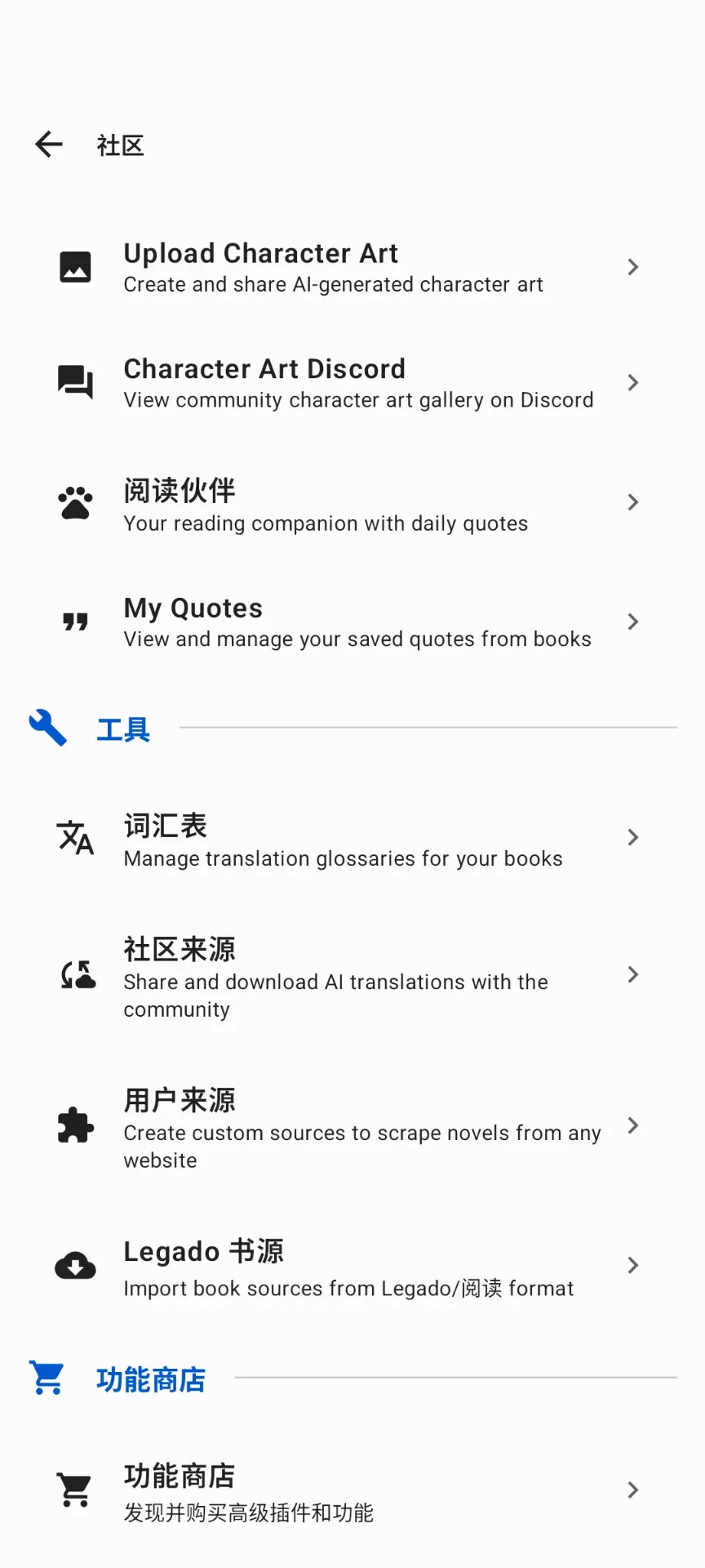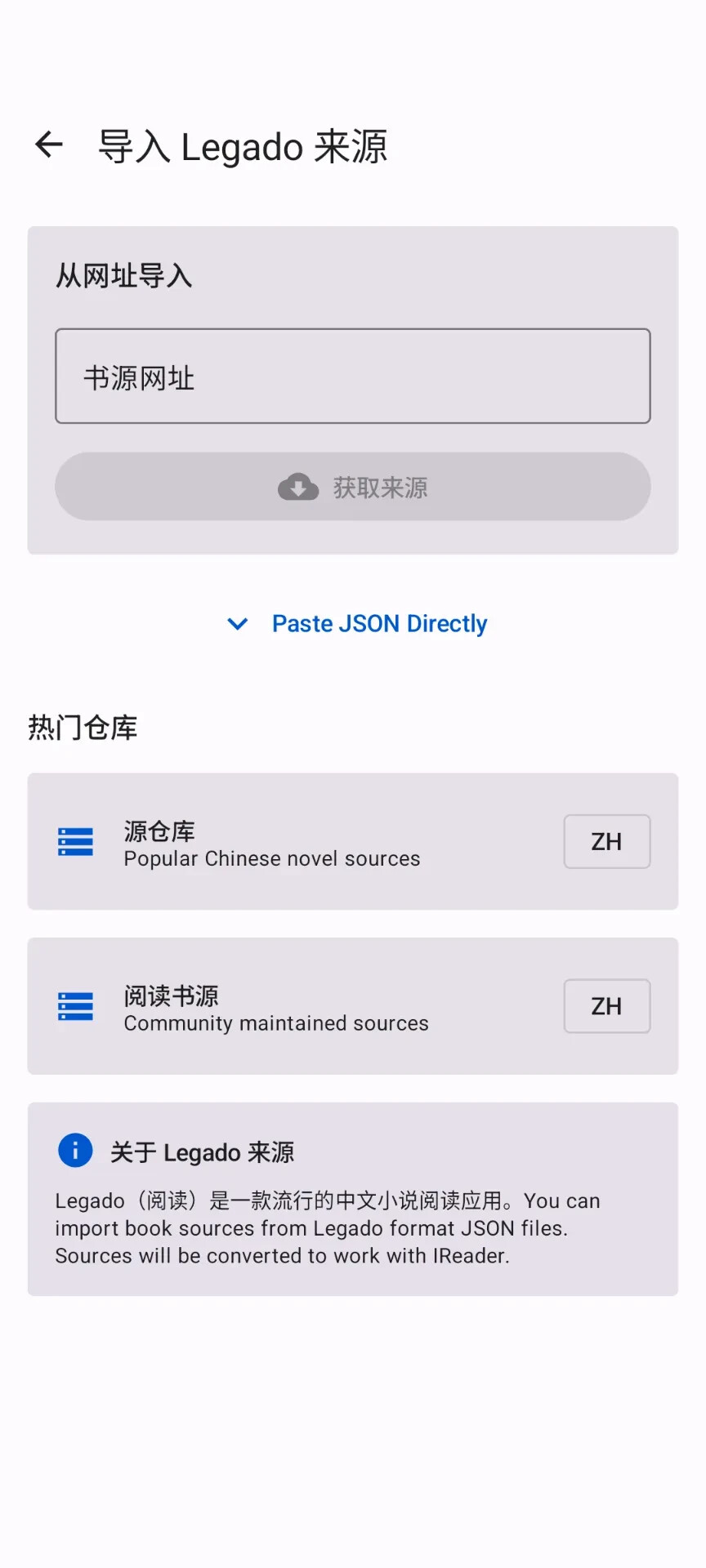 支持 自定义源、 Legado/阅读源 导入 更多 → 社区 → Legado 多平台支持, win10/Linux/Android