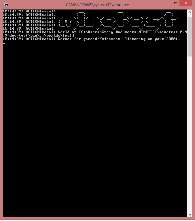 - 要启动服务器,您需要做的就是单击在上一步中创建的服务器启动器。如果您在程序文件(或任何其他受保护的文件夹)中安装了minetest,则需要右键单击启动器,然后选择“以管理员身份运行”。 它应该打开一个看起来像这样的窗口: