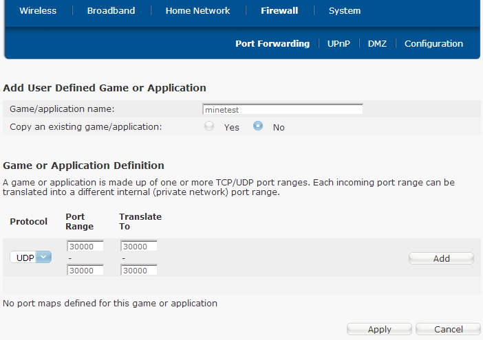 - 确保使用UDP 和端口30000 (三万),该端口范围内使用的端口应转换为相同的端口。单击应用。